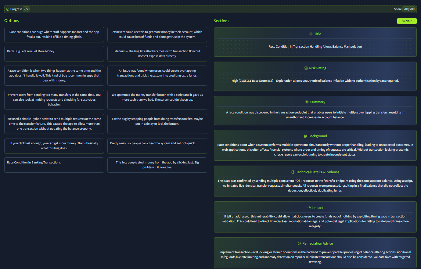 The vulnerability write-up section requires detailed technical documentation that balances comprehensiveness with clarity. This task tested my ability to structure technical findings in a professional format.