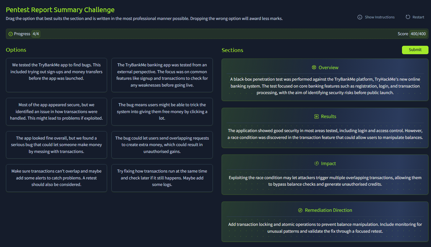 This is my walkthrough of the “Writing Pentest Reports” room on TryHackMe, where I learned the essential skills for creating professional penetration testing reports that effectively communicate security findings to both technical and non-technical stakeholders.